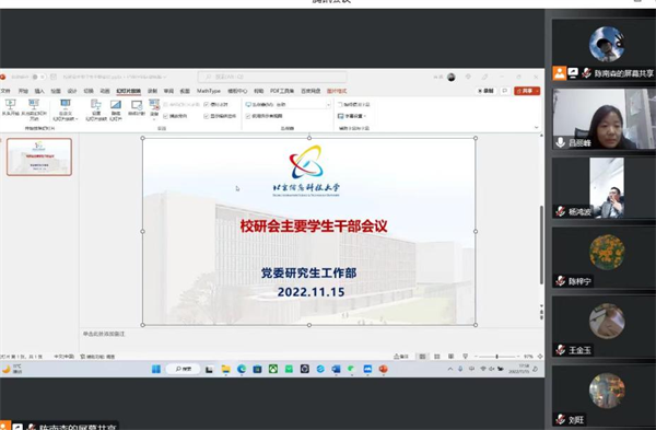 11月15日,党委研工部线上召开校研究生会主要学生干部工作会议。党委研究生工作部部长杨鸿波、研工部王海龙老师以及校研会主席团、部长团全体成员参加了本次会议。会议由研工部副部长吕丽峰主持。