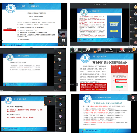 11月8日至13日,信息与通信工程学院组织全体本科生、研究生各班级陆续举办“学习二十大精神,共建美好家园”主题班会,深入学习宣传贯彻党的二十大精神,激励学生践行青年的担当与使命,共同建设文明平安校园。