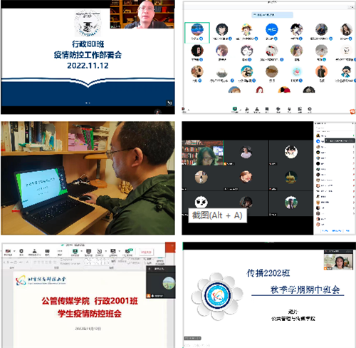 11月7日,学院面向全体班长和宿舍长召开线上学生骨干工作例会。学工老师们分别就近期学院党建、团学、奖助补贷勤等各项工作开展情况进行说明,就当前校院疫情防控工作进行部署指出,当前学校疫情防控工作的关键时期,全体学生骨干要带头遵守疫情防控规定,做好个人健康监测、坚持定期核酸检测、坚持每日健康打卡、加强个人防护,引导班级同学正确理解、积极配合、科学参与疫情防控。;学生骨干就近期班级同学线上学习生活、健康跑、核酸检测、健康打卡等情况进行总结汇报。