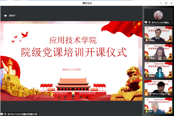 11月29日,应用技术学院通过线上形式举行了“永远跟党走 奋进新征程”2022年院级党课培训开课仪式。应用技术学院直属党支部书记赵晓林出席并进行授课,组织员孙柳青、党建辅导员尹国彪及50余名入党积极分子参加了仪式。开课仪式由应用技术学院直属党支部副书记杜平主持。