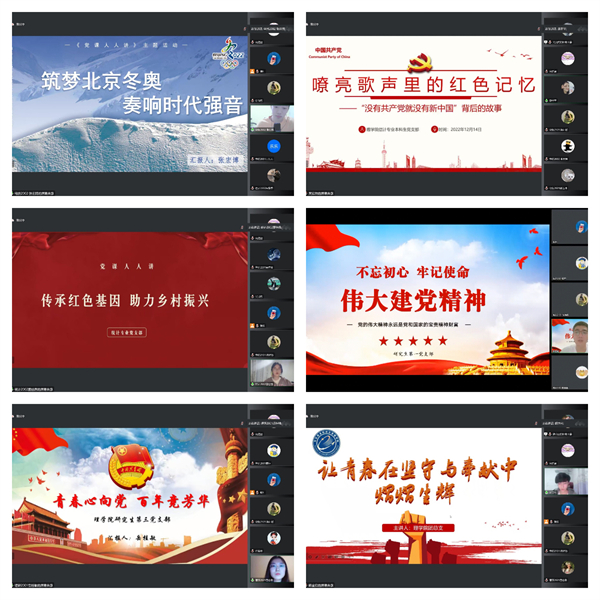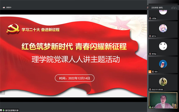 12月14日,理学院“红色筑梦新时代 青春闪耀新征程”党课人人讲宣讲活动在线上举办。活动以学习贯彻党的二十大精神为主旨,采取在线讲授主题“微党课”的形式展示党支部理论与实践学习成果。学院党委副书记谢司、组织员裴鹏程、辅导员阿雨萌、张恒出席活动,学院全体学生党员、初级团校学员参加此次活动。