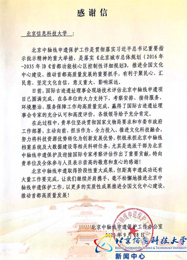 近日,学校收到北京中轴线申遗保护办公室感谢信。来信充分肯定我校坚决贯彻国家文物局要求和市委市政府工作部署,主动向前、担当作为、全力投入,选派干部前往北京中轴线申遗保护工作办公室支持申遗工作。来信认为,我校积极承担中轴线申遗办档案系统及大数据库建设相关科研任务,发挥科研智库作用,用科技成果助力北京中轴线申遗,为北京中轴线申遗保护特别是迎接国际专家考察评估作出了重要贡献。