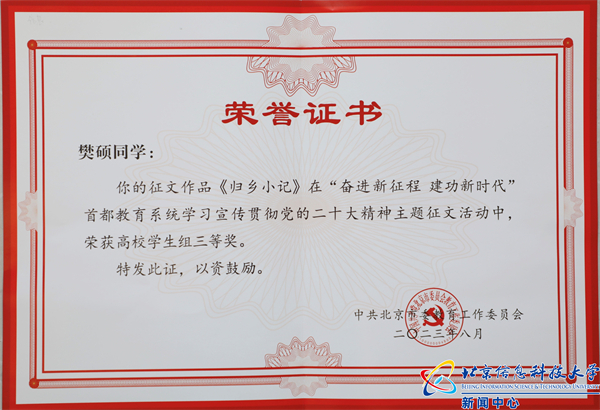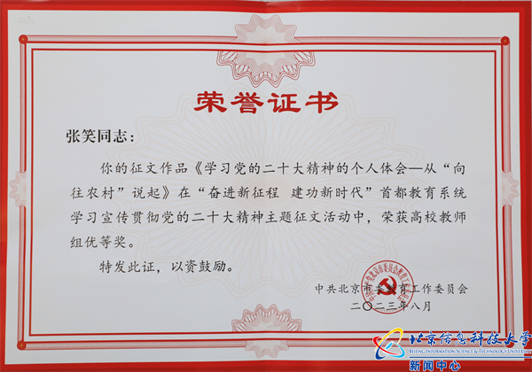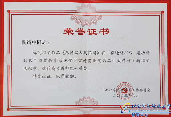 日前,中共北京市委教育工作委员会公布了“奋进新征程 建功新时代”首都教育系统学习宣传贯彻党的二十大精神主题征文活动获奖情况,我校图书馆陶靖中老师提交的作品《尽情写入胸怀间》在众多作品中脱颖而出,荣获高校教师组一等奖,公管传媒学院张笑老师的作品《学习党的二十大精神的个人体会——从“向往农村”说起》荣获优秀奖;外国语学院樊硕同学的作品《归乡小记》荣获高校学生组三等奖。