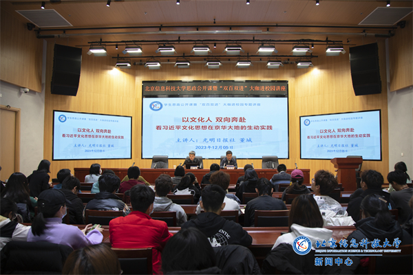 董城以当下中国发展新的历史方位及面临的新形势、新任务发端,深刻阐释了习近平文化思想的科学内涵、理论品格和时代特征,同时立足首都北京深厚的文化底蕴和全国文化中心发展定位,解读了北京建设贯彻落实习近平文化思想首善之区的示范意义和引领作用。讲座结合高等教育“立德树人”根本任务和首都发展战略,从中央党报记者视角诠释了首都北京沿着习近平总书记指引的方向奋力前行的一系列生动实践,强调要遵循“在现场”的场景设计,“在路上”的认知方法,“在心间”的情感路径,围绕“把接力棒更好传给下一代”打出一套组合拳,打通情感与信仰、知识与能力、学术与创造之间的壁垒,把培养时代新人的使命担当融入实践各环节、全过程,推动文化优势与教育优势强强联合,让青春洋溢的青年学子与如火如荼的首都文化建设双向奔赴,让习近平文化思想真正化作引领成长,以及凝聚中华民族精气神的最深沉持久的力量。