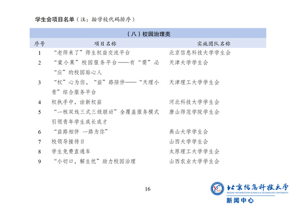 近日,由共青团中央指导、全国学联主办的全国高校学生会组织“我为同学做实事”项目交流展示活动最终结果公示,经学校自荐、省级推报、全国遴选,由北京信息科技大学学生会申报的“老师来了”师生权益交流平台成功入选“校园治理类”专项,这也是北京高校入选“校园治理类”的唯一项目。