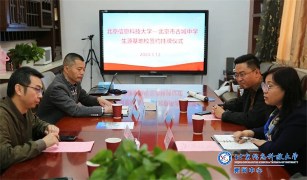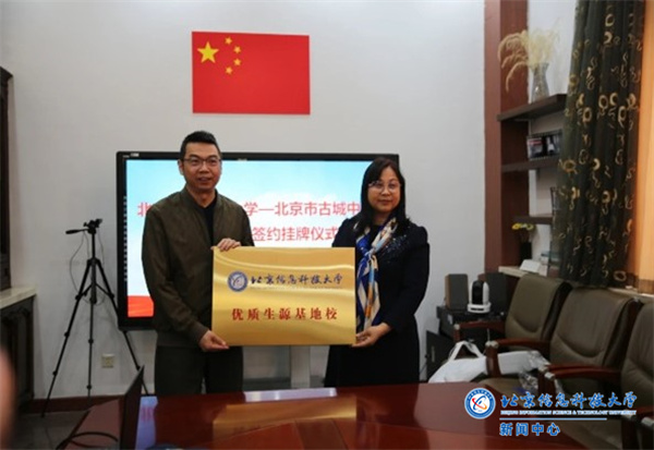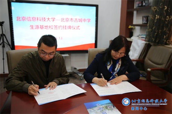 3月13日下午,学校与北京市古城中学携手共建生源基地校,在古城中学举行“优质生源基地校”签约挂牌仪式。古城中学校长林乐光,副校长周亚宏、孙志田,德育处主任王新凯,我校信管学院院长王红军、副院长王磊、招就处处长助理温源参加仪式。