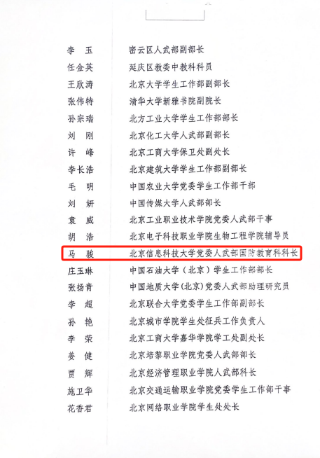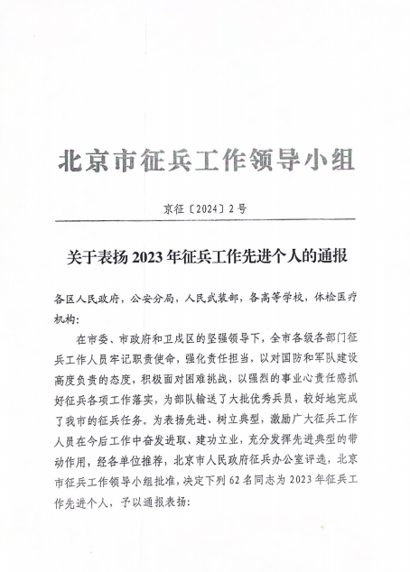 近日,北京市征兵工作领导小组下发了《关于表扬2023年征兵工作先进个人的通报》,我校武装部马骏老师获北京市2023年征兵工作先进个人荣誉称号。