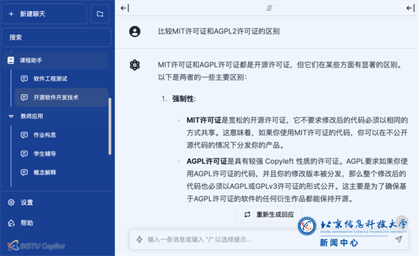 我校是首批北京市属高等学校数字校园示范校、首批北京市教育信息化融合创新“双百”示范行动智慧校园融合应用示范基地单位、首批北京市智慧校园示范校。学校一贯积极探索教育数字化,推进人工智能在教学、管理等方面的应用。2023年初,信息网络中心开始调研国内外高校的相关人工智能教育研究和案例,进行探索和尝试,开发的基于校园数据的智能问答系统于2023年6月上线试运行,在北京市属高校中率先应用大语言模型技术。BistuCopilot以“自主应用开发+开源中间件+大模型API”的模式,将学校的主要业务场景,例如信息网络、教务、财务、后勤、学工等建立知识库,7*24解答师生的问题,提高服务质量。基于BistuCopilot,信息网络中心指导学生创新团队开发了“智能比斯兔”语音智能硬件,在2024年广交会上首次亮相,并于5月12日学校校园开放日暨高招联合咨询会上与考生及家长进行语音互动。这一新颖的高招咨询方式,受到中国教育电视台、北京日报、现代教育报等新闻媒体的关注报道。