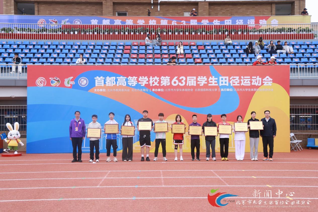 5月18日,首都高等学校第63届学生田径运动会(以下简称“首高会”)在我校盛大开幕。本届首高会汇聚了首都众多高校的体育精英,运动会为期4天,共有1567名运动员在116个田径项目中展开激烈角逐,是首都高校间体育竞技与交流的重要平台。作为承办单位,我校精心筹备,从场地布置到赛事组织,从后勤保障到志愿服务,每一个环节都做到细致入微,为参赛选手和观众提供优质的赛事体验。我校田径代表队在吴淑君、江群两位教练的带领下比赛完美收官,交出了一份令人瞩目的成绩单。取得三金两银一铜共计12项前八名的历史最佳成绩!男子团体荣获乙组男子团体总分第八名,实现学校在首高会历史上的重大突破。