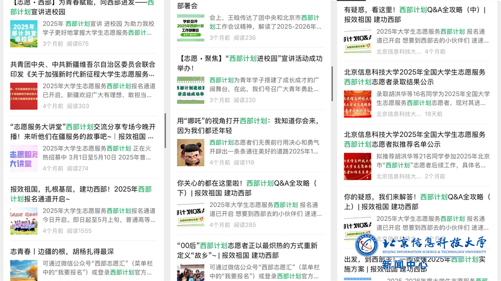 为落实团中央和北京团市委相关工作要求,深入推进共青团促进大学生就业工作,进一步扩大西部计划影响力,我校于今年3月启动了西部计划宣传与志愿者招募工作。在学校党委的高度重视下,校团委联动各学院团委(团总支),采取“线上+线下”双渠道宣传模式,围绕政策解读、志愿故事等内容发布西部计划系列推送近40篇,举办3场宣讲活动,在食堂、教学楼等人流密集区域设置西部计划宣传展板,形成了到建设西部、奉献基层的浓厚氛围,吸引了超过200名学生从各渠道咨询,70余名学生填写报名系统。