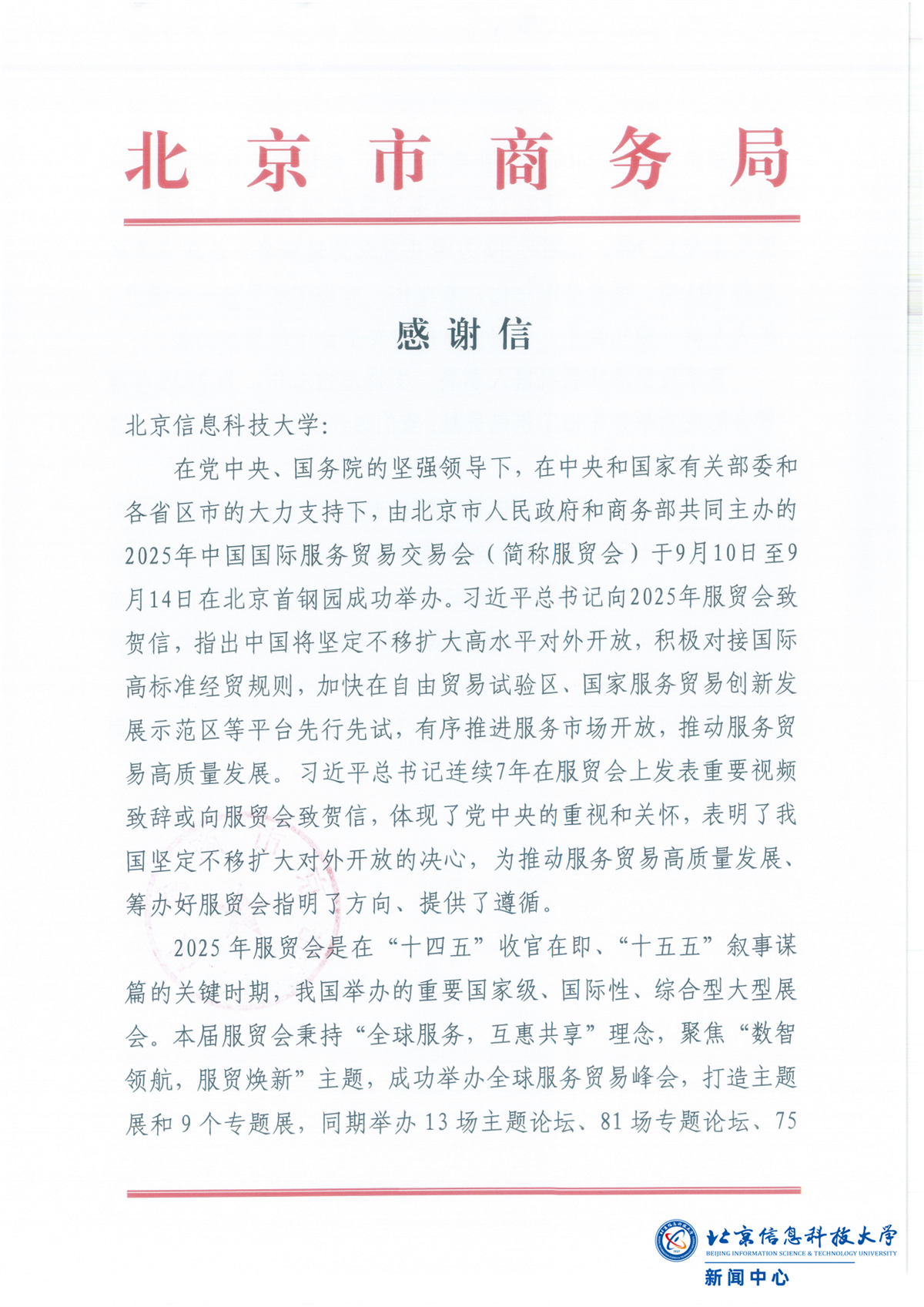 9月19日,北京市商务局向我校发来正式感谢信,对我校在2025年中国国际服务贸易交易会(服贸会)中的突出贡献表示衷心感谢。感谢信特别指出:"贵单位紧急协调机器人参展,支持巡馆工作,为2025年服贸会的成功举办作出了积极贡献。"这充分体现了北京市政府部门对我校技术实力和组织能力的高度认可。我校作为北京市市属高校,能够参与此次重要的活动,也体现了北京市政府对我校的信任和重视。